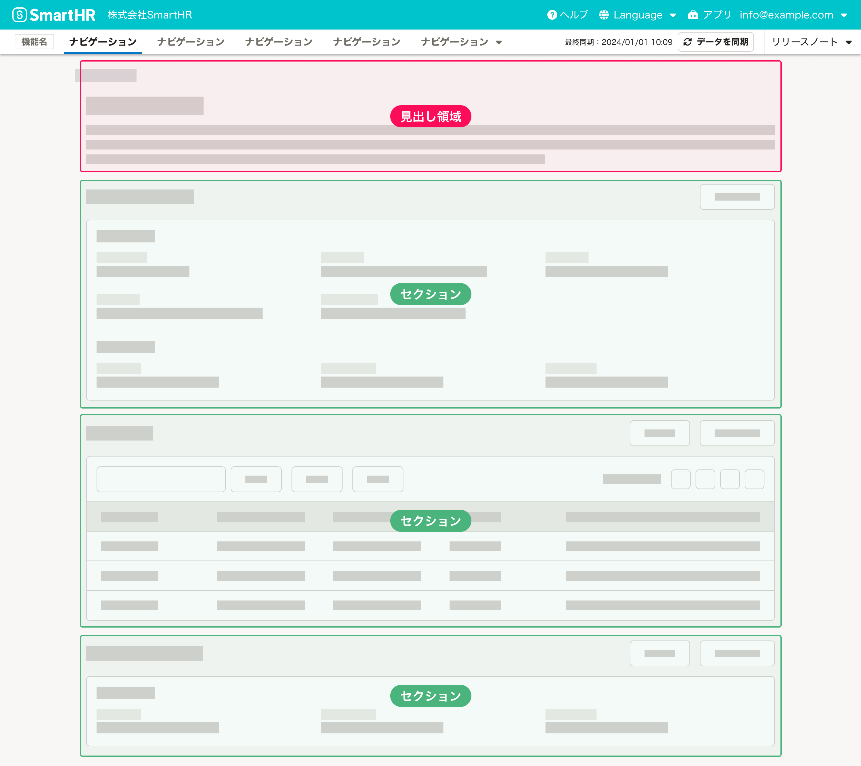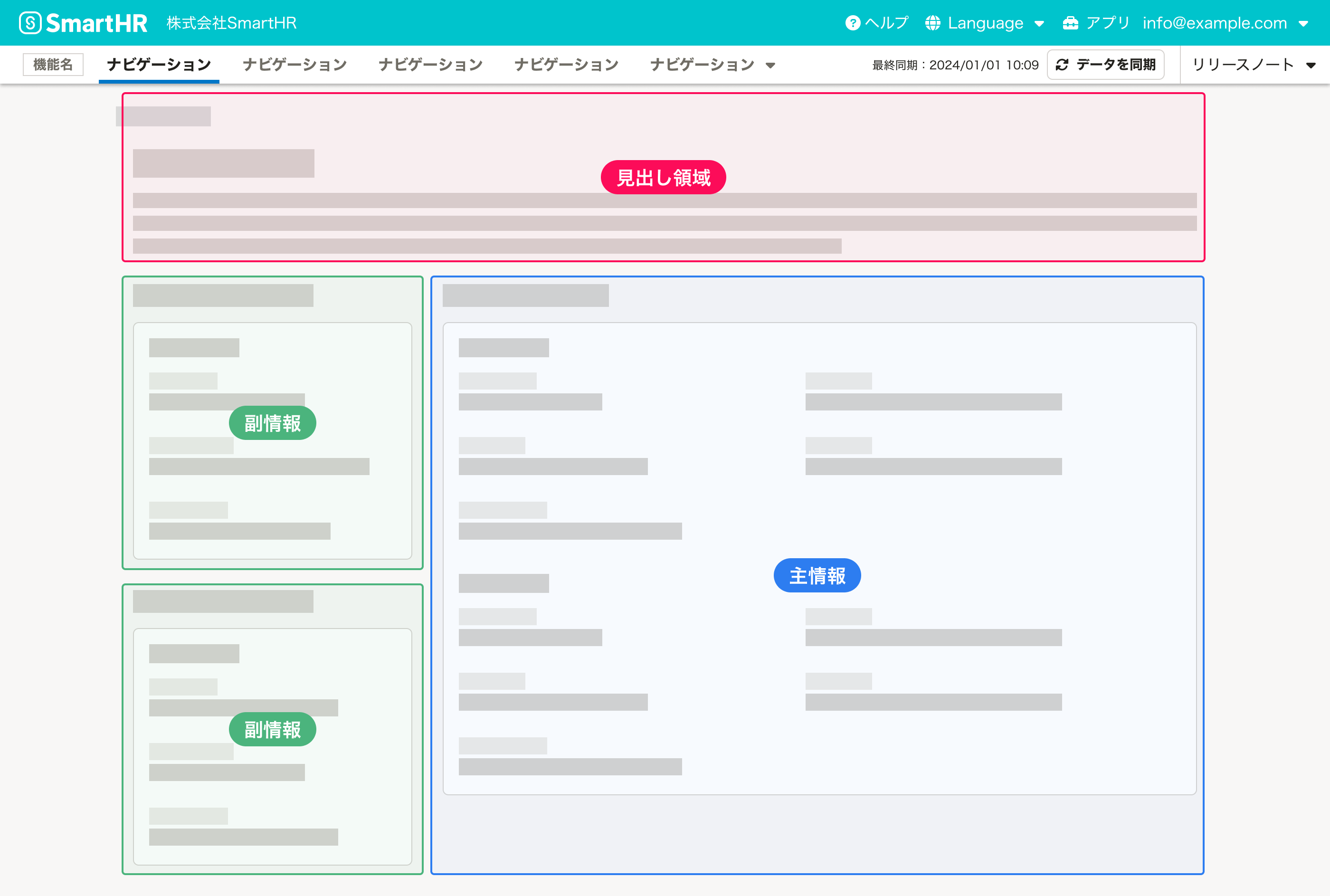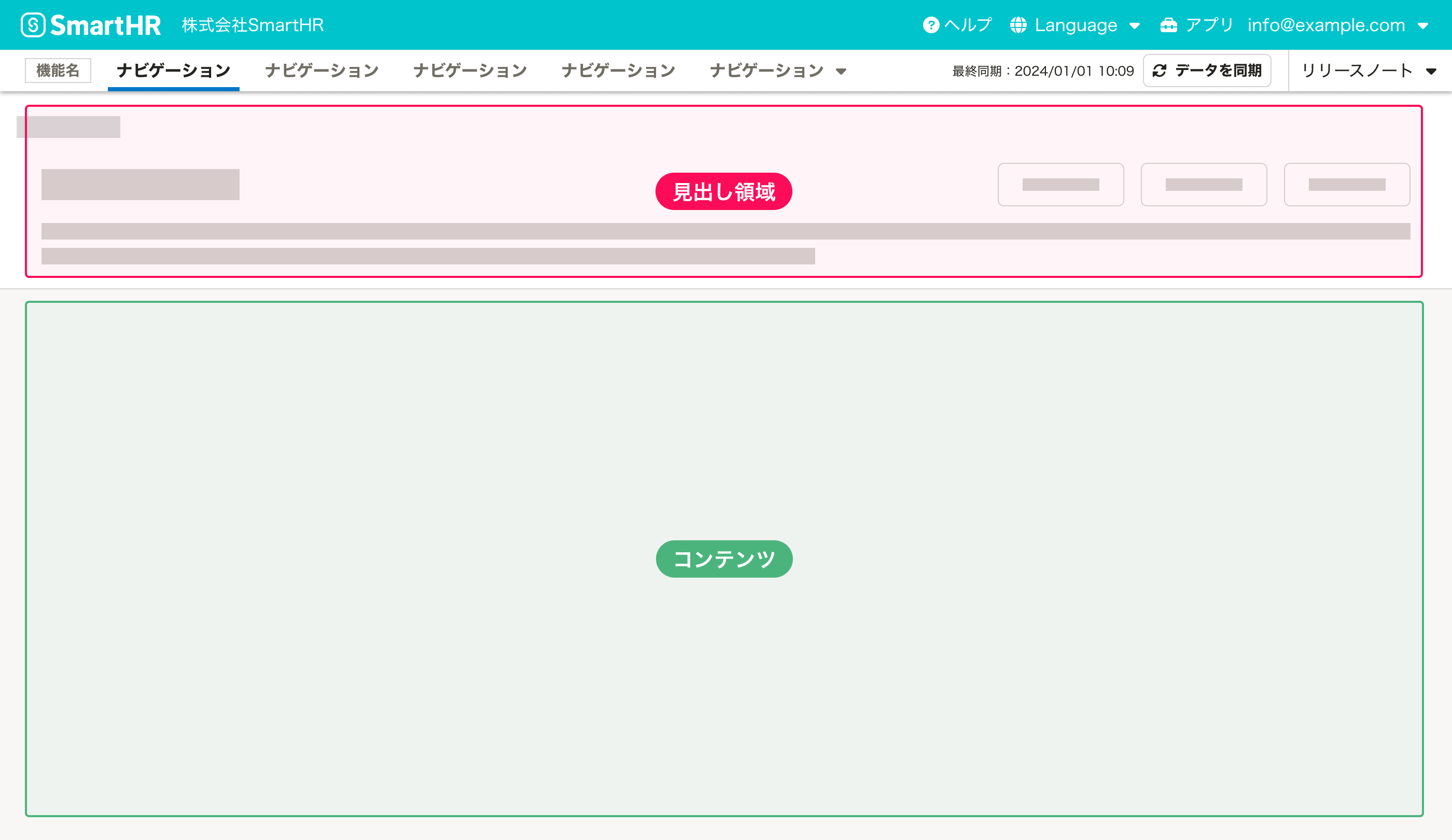 エラー画面を除き、SmartHRのページは以下の要素と領域によって構成されます。