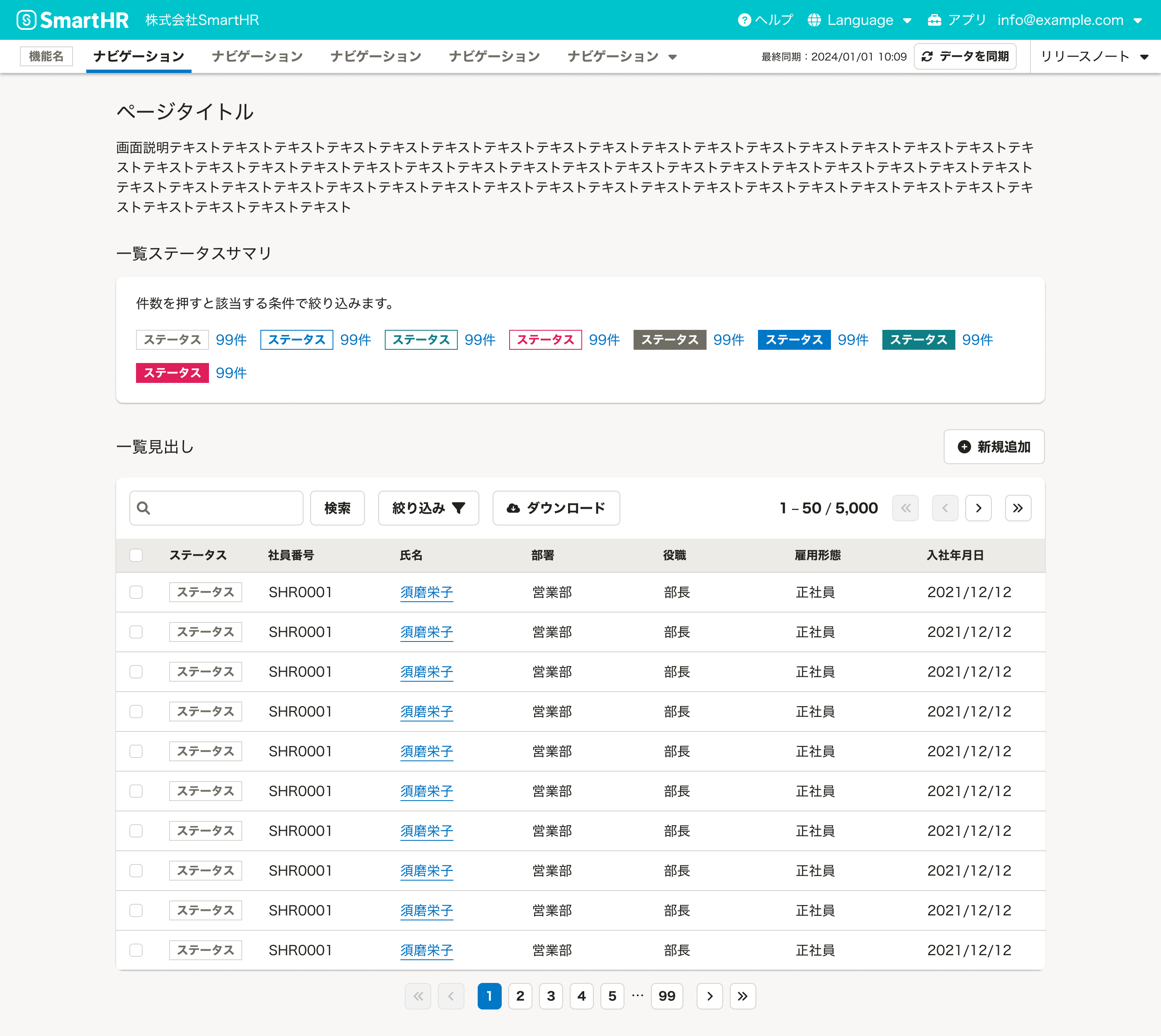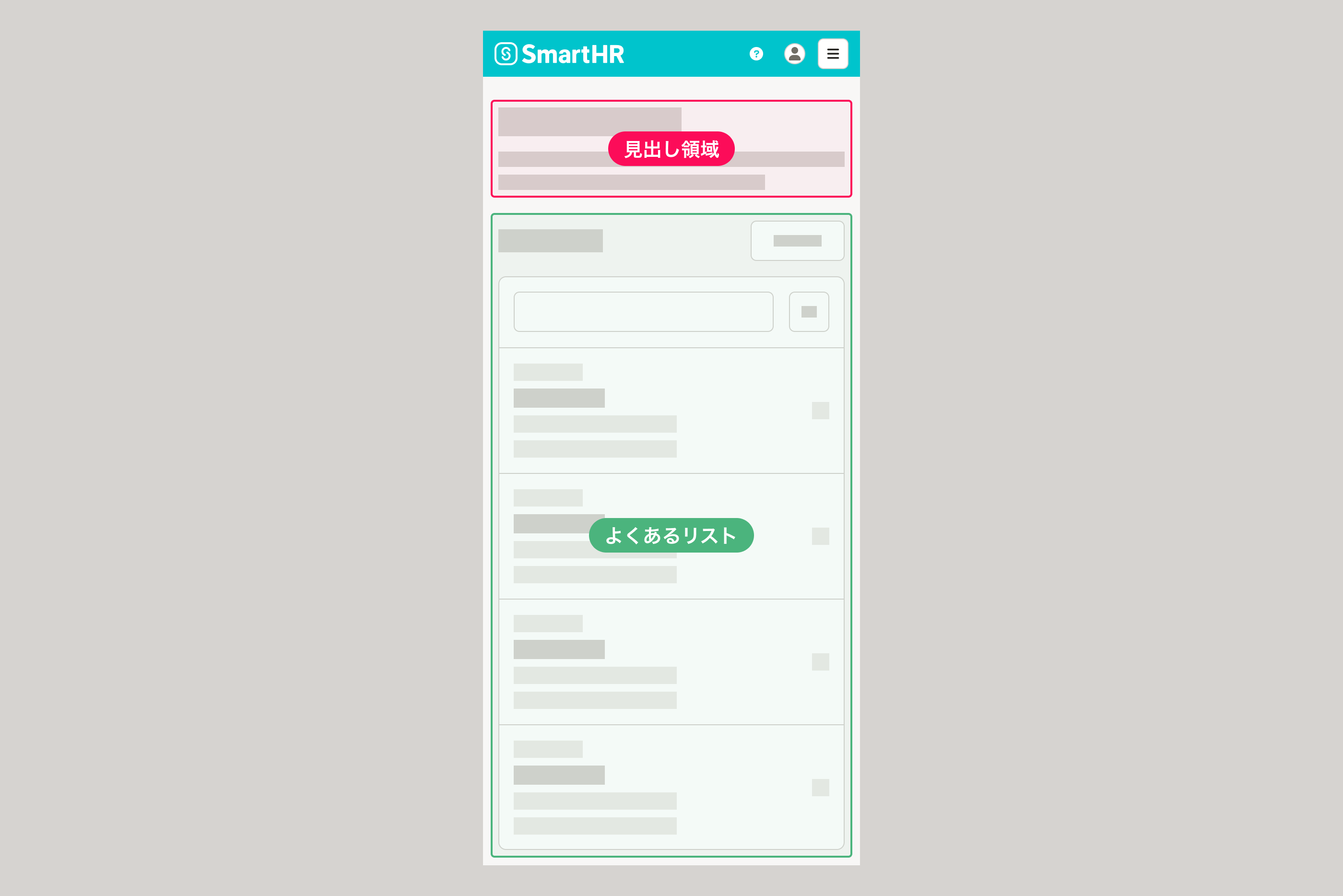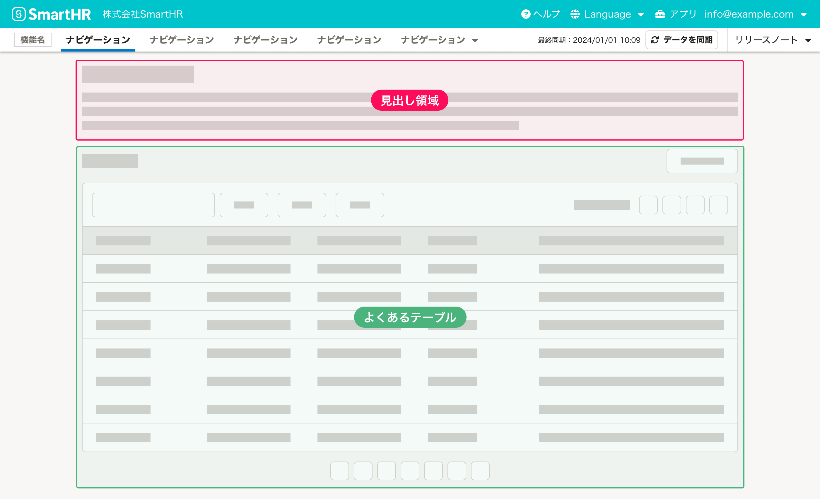 エラー画面を除き、SmartHRのページは以下の要素と領域によって構成されます。